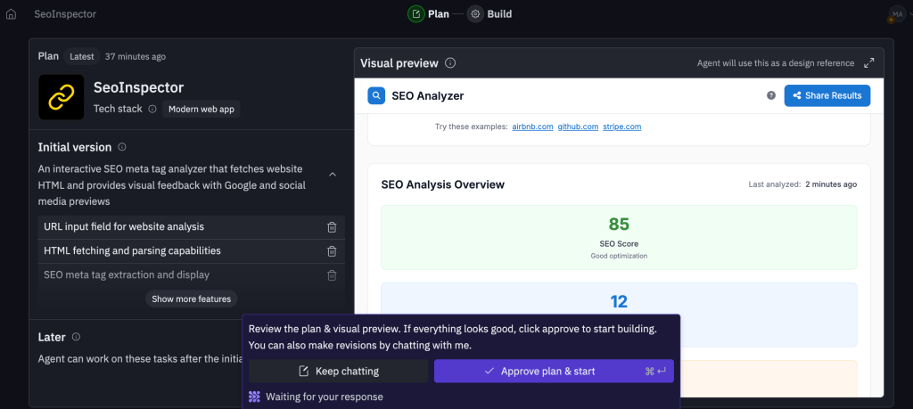 The Replit Agent presented a plan for me to review and approve. It outlined key features like URL input field and SEO meta tag extraction, along with a first visual preview of the interface.
