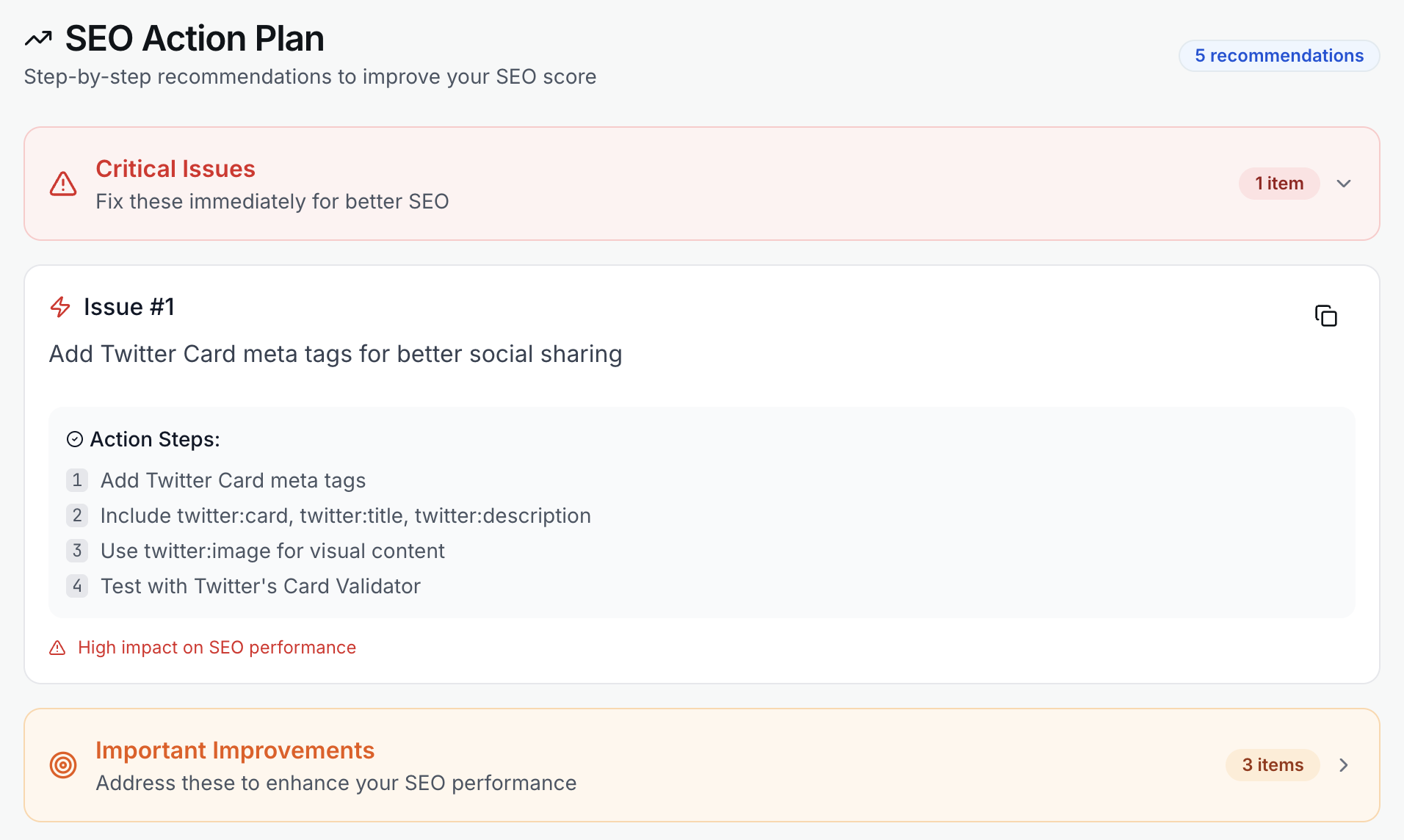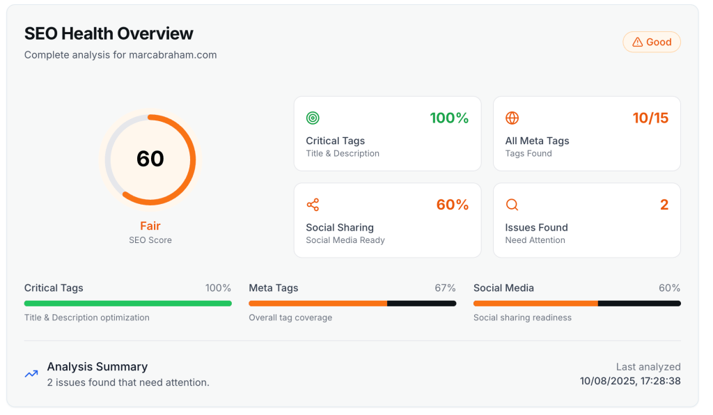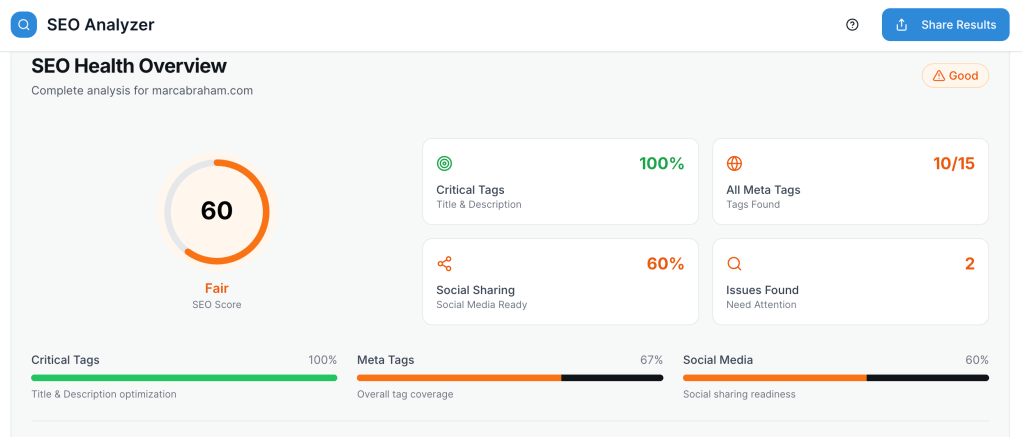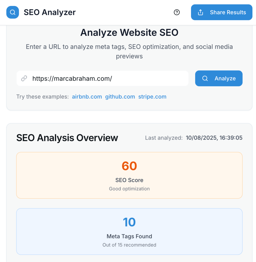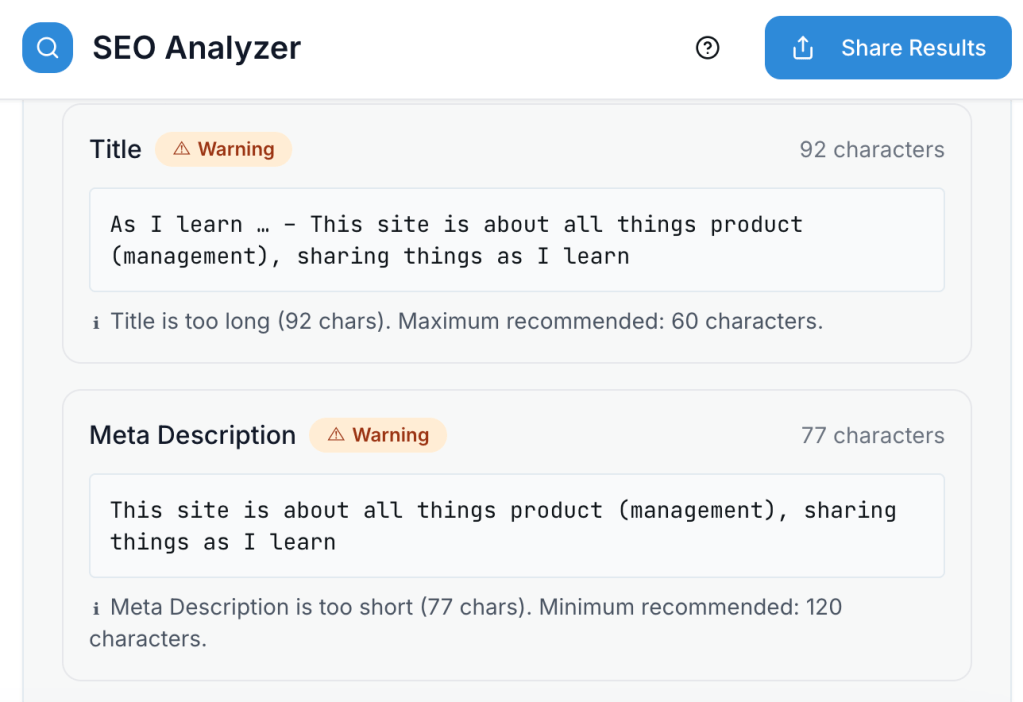 I tested the first version by entering my blog’s URL. The analyser pulled through basic SEO data like meta descriptions, title tags, and page structure – exactly what I’d hoped for.