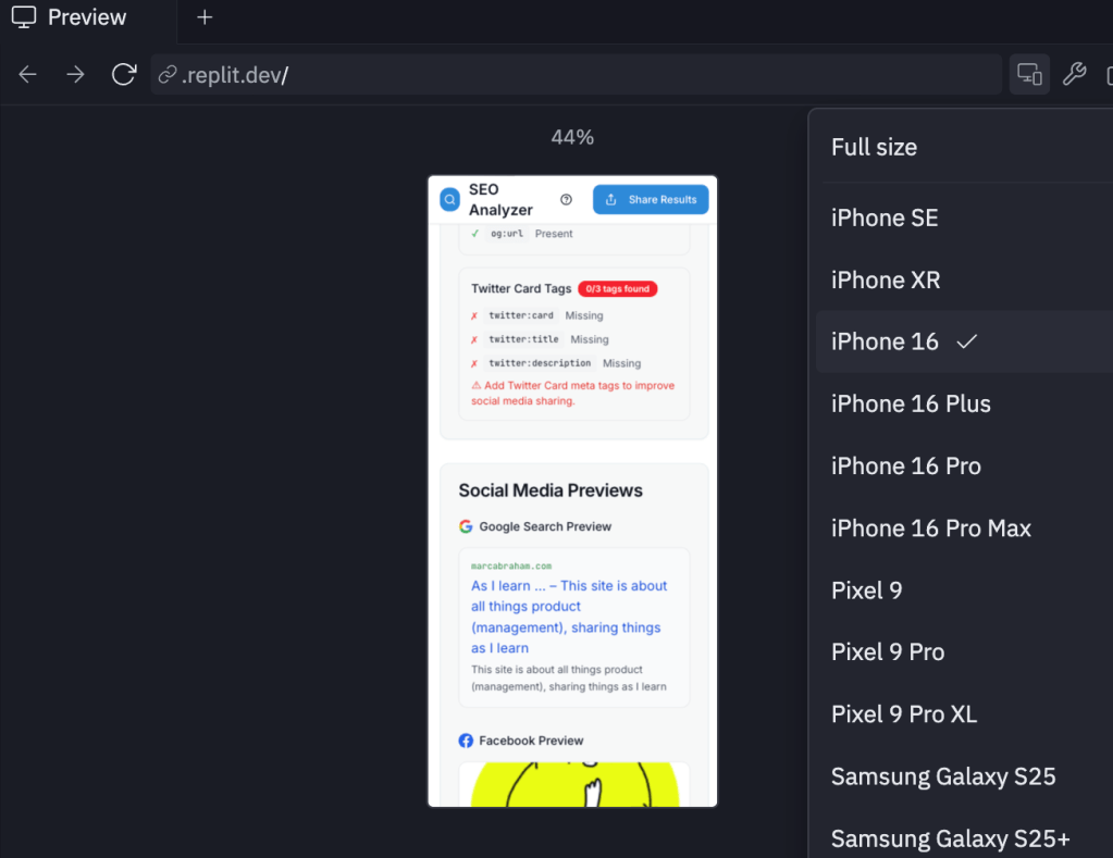One feature I found particularly helpful was Replit’s “screen size” functionality. I could see how the app looked on iPhone or Android devices and make adjustments accordingly. When I spotted layout issues on mobile, I prompted the AI to make the app more responsive, being specific about what needed changing.