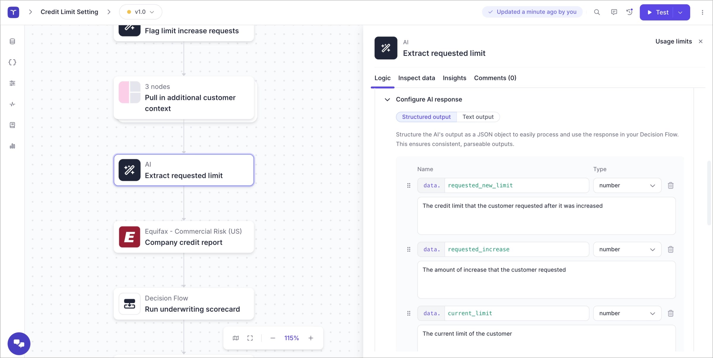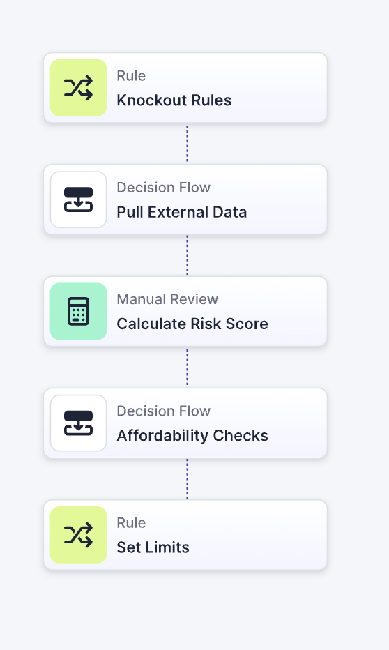 You can add “AI nodes” to your workflow to use LLMs in your decision flows and leverage their responses for your decisioning logic. These pre-built nodes represent business rules and predictive models.