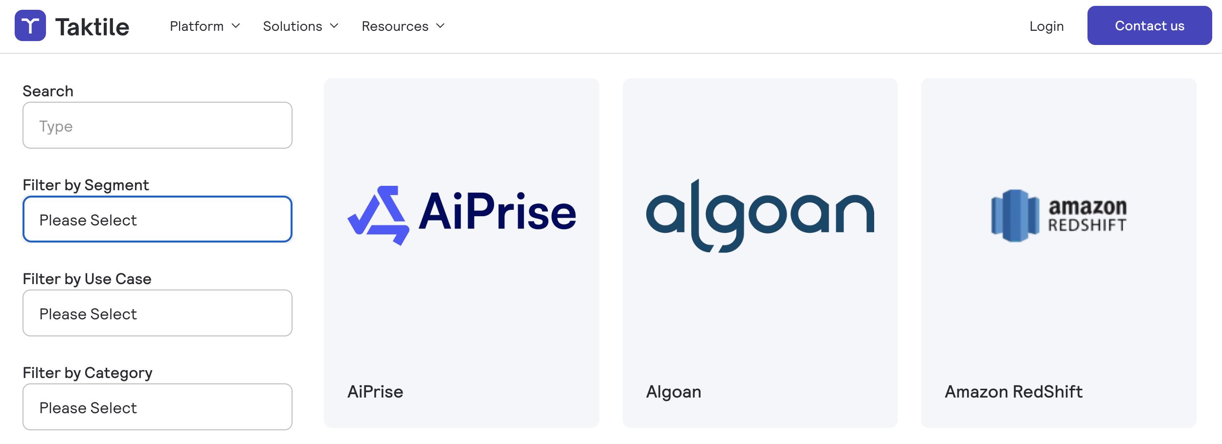 You can pick additional external data sources to incorporate into your workflows using Taktile’s data marketplace with out-of-the-box integrations to third-party data providers ranging from cloud providers to credit bureaus.