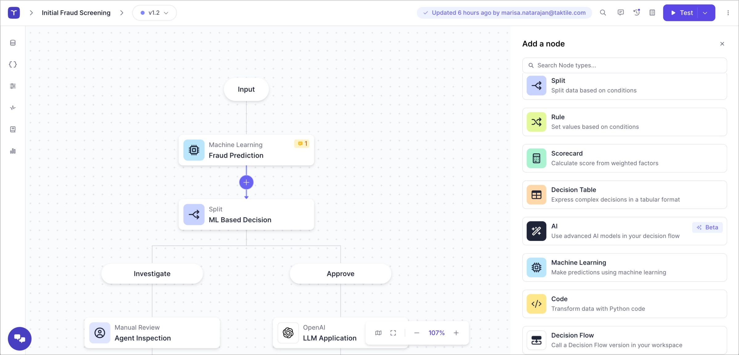 Taktile offers a drag-and-drop interface which is designed to make it as intuitive as possible for non-technical back-office employees to create and customise their workflows and reduce decision time. It features an AI Copilot that helps users generate decision logic from plain language descriptions, understand existing code and debug issues.