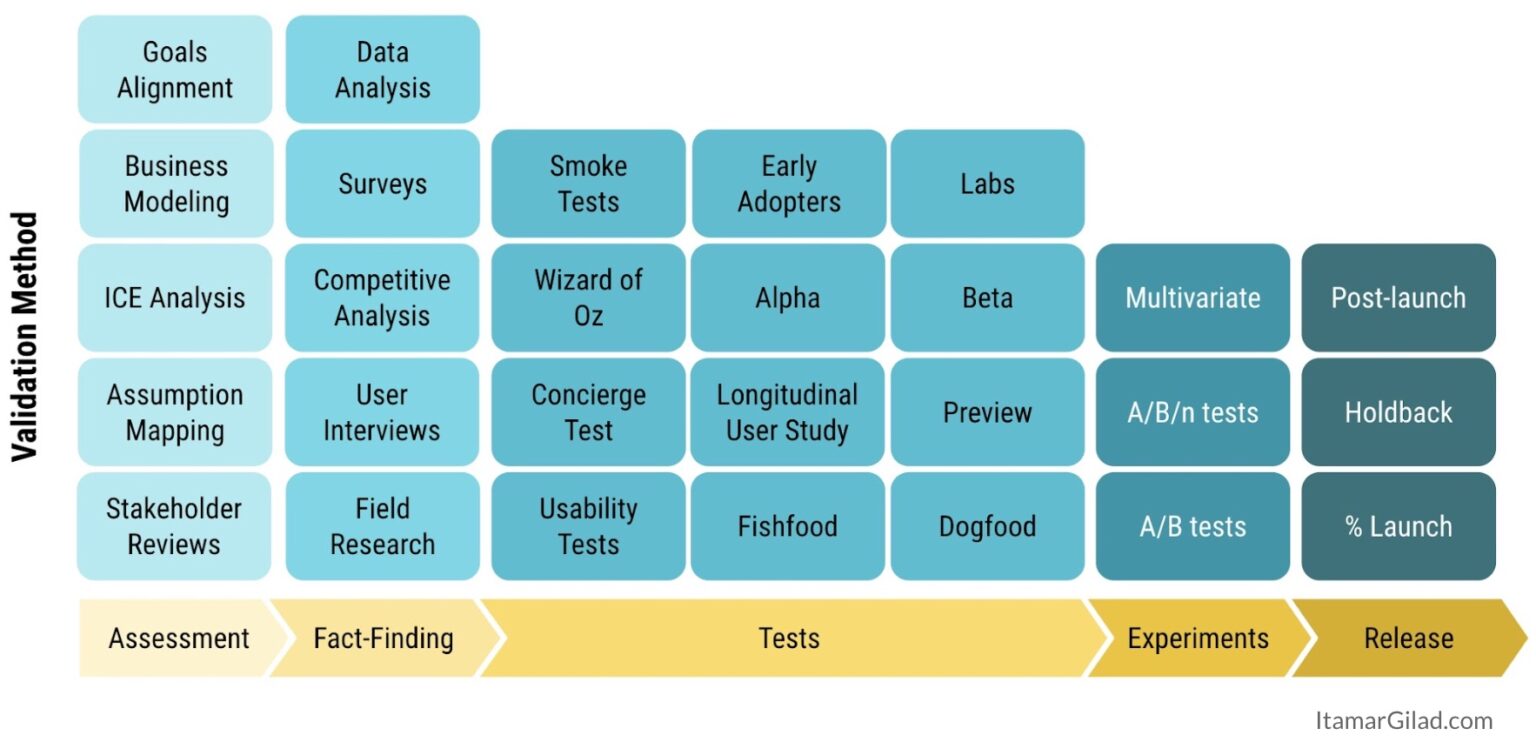 Steps – The steps are the activities we do to validate our assumptions (or refute the risks). Once we know what to test, there’s a wide range of validation tactics we can use. Gilad groups these under the AFTER acronym: Assessment, Fact-Finding, Tests, Experiments, and Release Results.