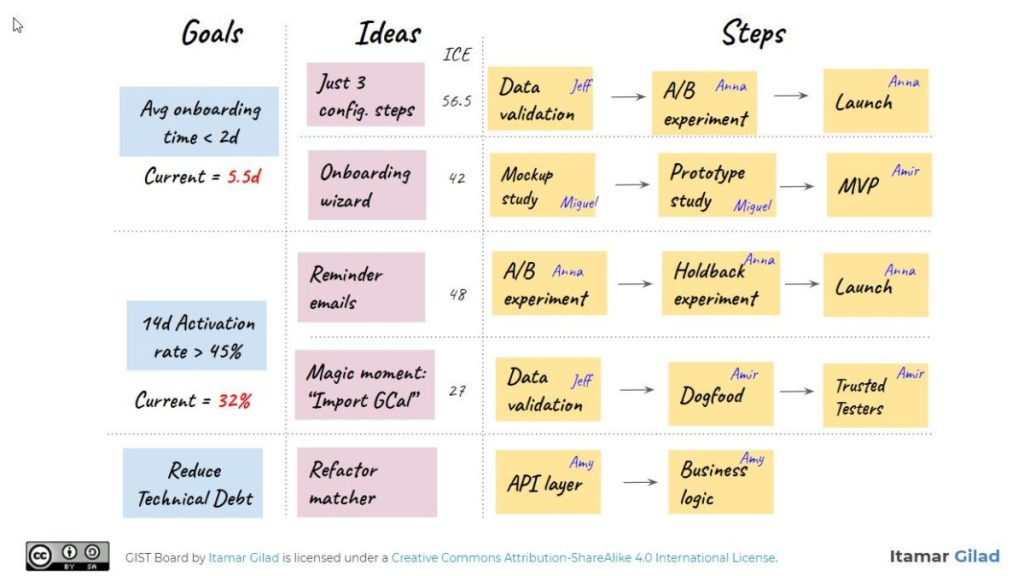 Tasks – The final layer of GIST is about ensuring your product team is aligned around the actions and decisions needed to achieve goals, find high-impact ideas and test them. The team needs to operate from the same context and be empowered to make decisions within that context. In the book, Gilad introduces the GIST board which teams can use to create shared visibility of what they’re working on.