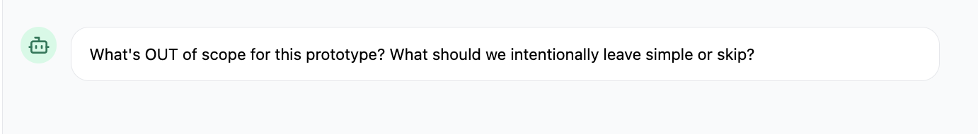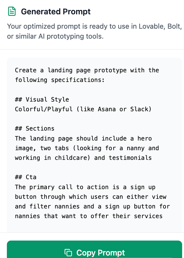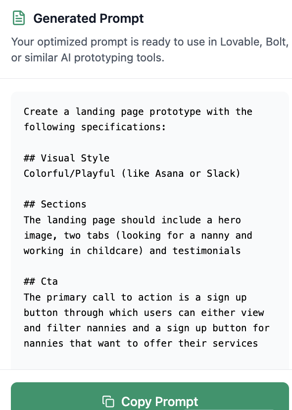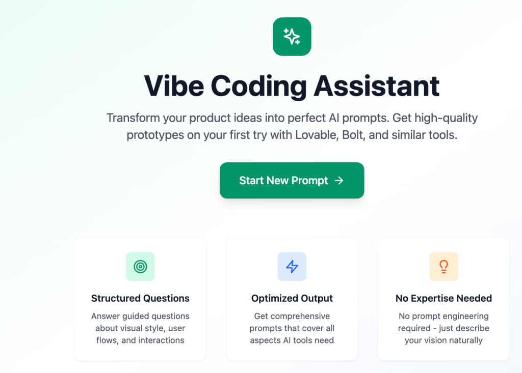 Main learning point: I deployed my vibe coding assistant here. There’s a nice irony in building a “vibe coding” assistant”; even if my goal is to help people build on the fly and remove onerous planning upfront, I still needed some time to figure out how my assistant would complement (and not duplicate) the prompting capabilities already built into tools like Bolt and Lovable. The foundation of critical product think still matters, even just to provide the AI with the right level of context.