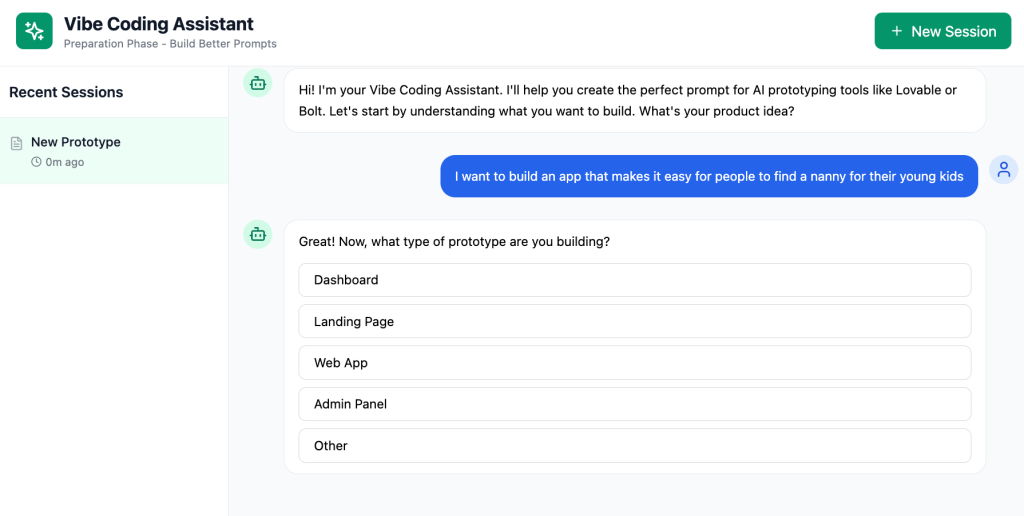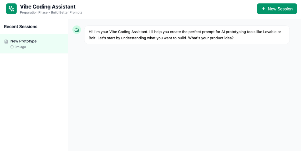 I like tinkering with new product ideas. I struggle sometimes with the quality of my prompts – taking my idea and prompting tools like Bolt or Lovable to create a prototype. It’s that classic cold start problem where you don’t know what you don’t know. Just for fun, I wanted to see if I could build a vibe coding assistant that helps people generate more detailed prompts, giving their AI tools the right input.