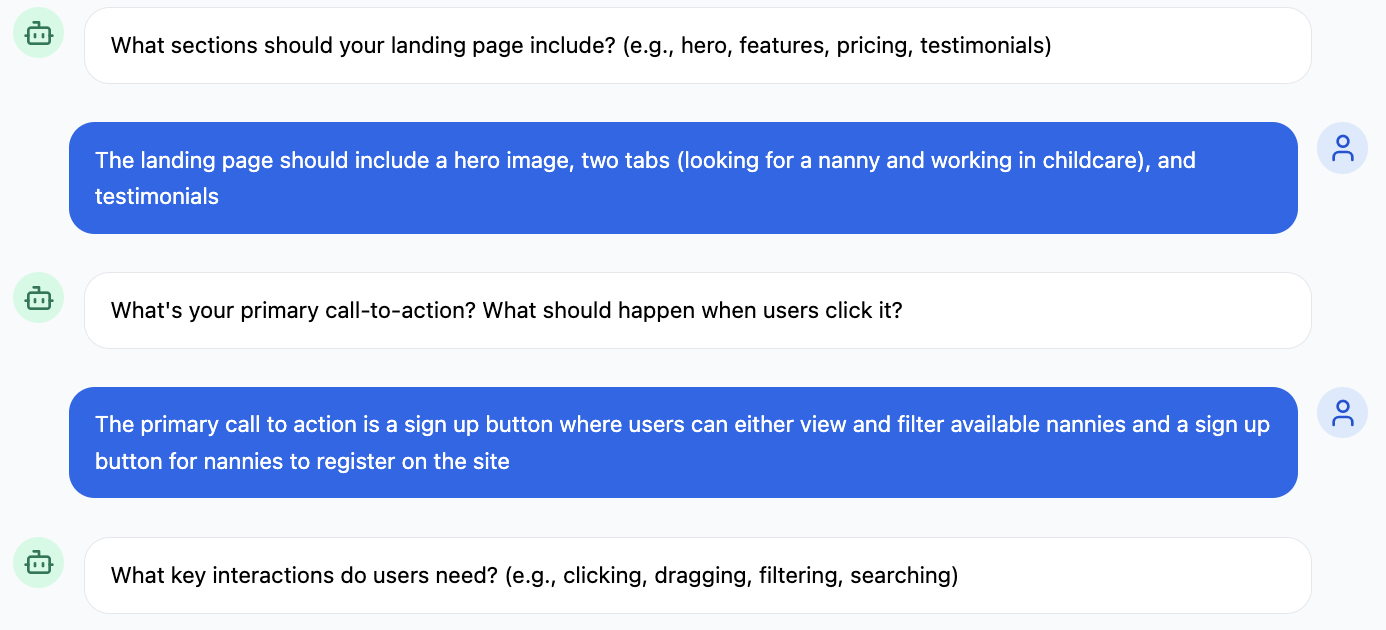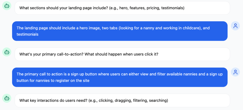 I’m not unhappy with the first output. The chat interface feels intuitive and asks the right questions for users to get started with their idea.