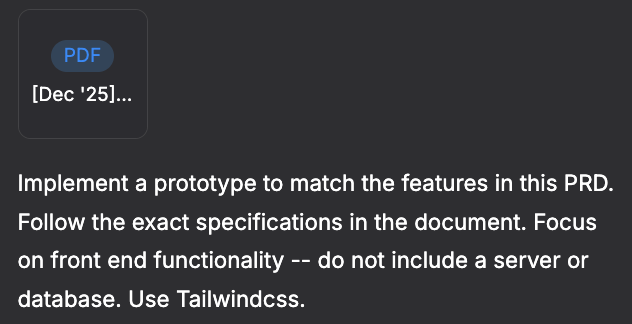 My first prompt is simple enough: I want to implement the PRD and focus on front-end capability only.