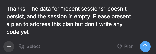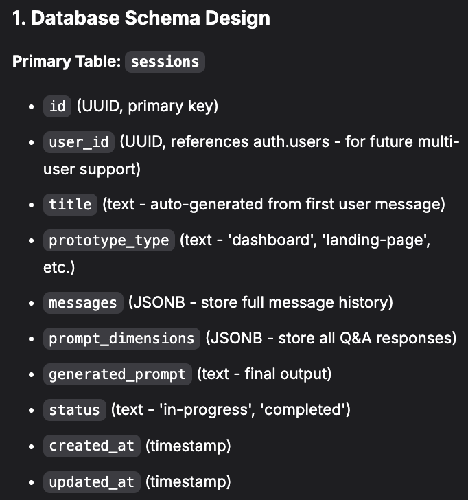 Because of my instructions to only focus on the front-end, none of the sessions in the vibe coding assistant are persisted. I want users to be able to go back to previous sessions and retrieve prompts they’ve generated.