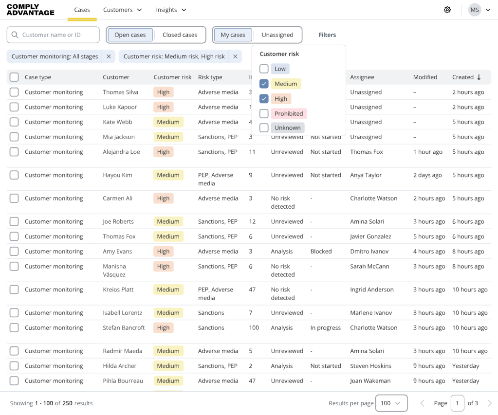 Customer Screening – Continuous monitoring of business customers for compliance with internal and regulatory requirements. ComplyAdvantage automatically flags hits, screening for sanctions, regulatory and law enforcement actions, and negative media content. Users can configure customer screening to meet their specific risk and cost of compliance goals. For example, automated risk assessments allow teams to focus on highest-risk customers first rather than wading through hundreds of false positives.