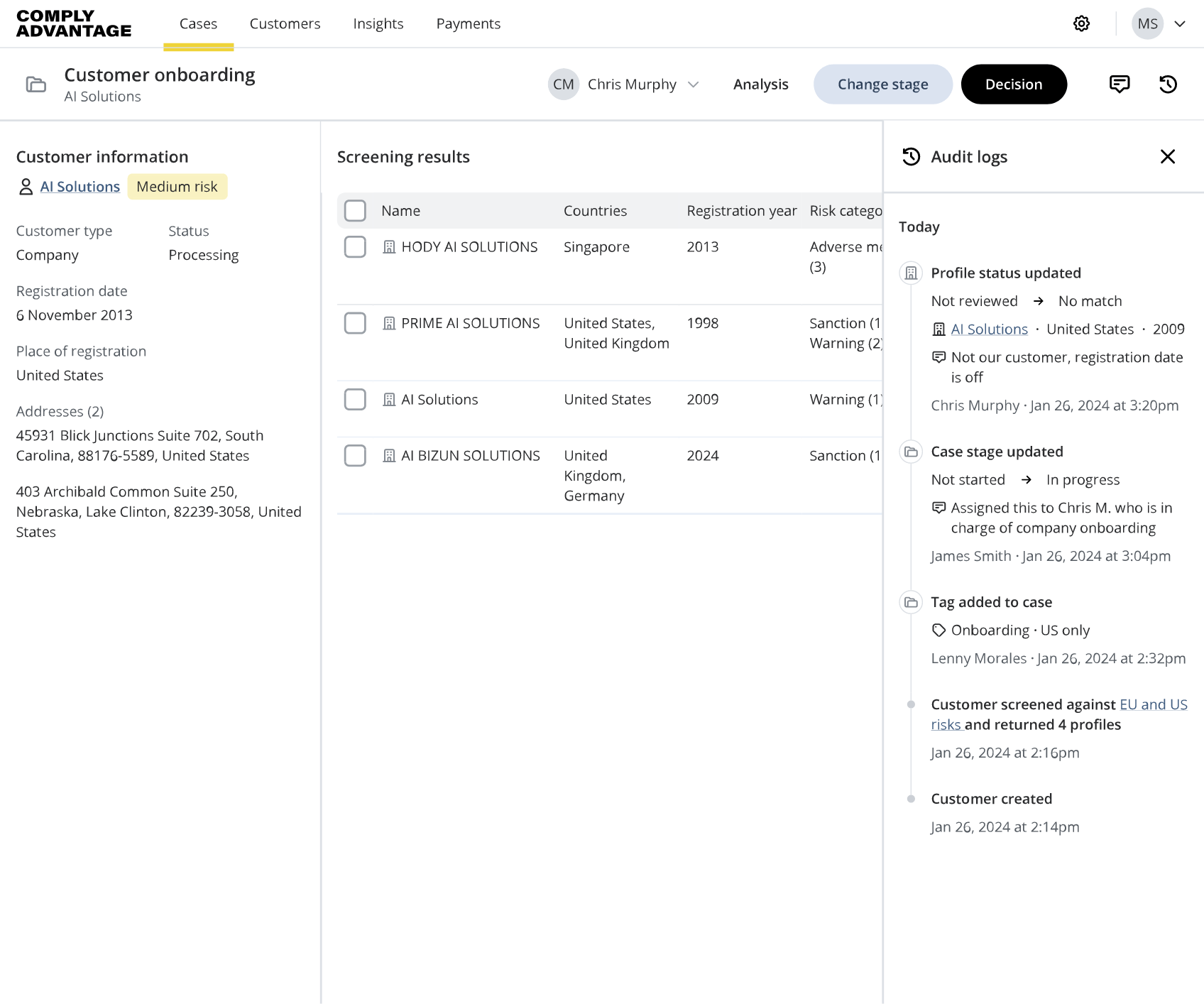 Company Screening – Similar to customer screening, ComplyAdvantage automates the screening of companies for sanctions, regulatory and law enforcement actions, and negative media content.