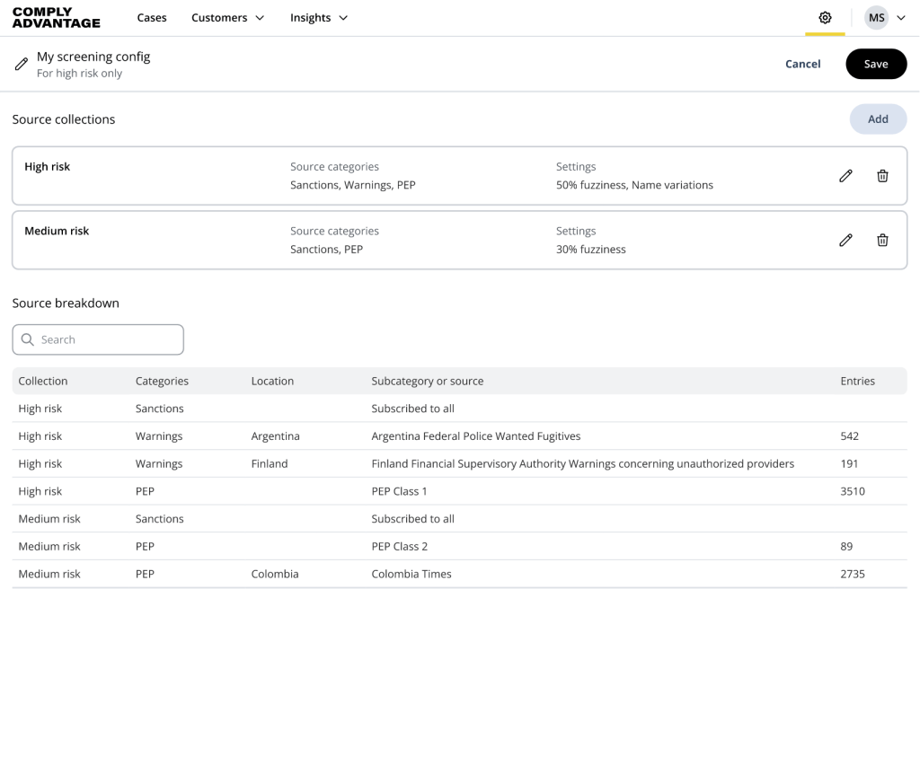 Looking at above screenshot I wonder about the configurability of the screening dashboard designed for compliance teams. How easy is it to add a new “source collection” or change the “settings” to reflect internal compliance standards?