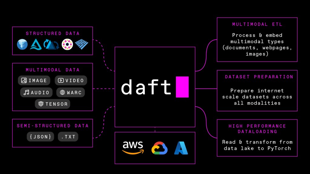 Daft enables companies and developers to work with diverse data formats within a unified framework. The key difference from traditional DataFrame systems like Pandas is that Daft is designed specifically to handle unstructured data — images, audio, embeddings — natively, rather than relying on external libraries.