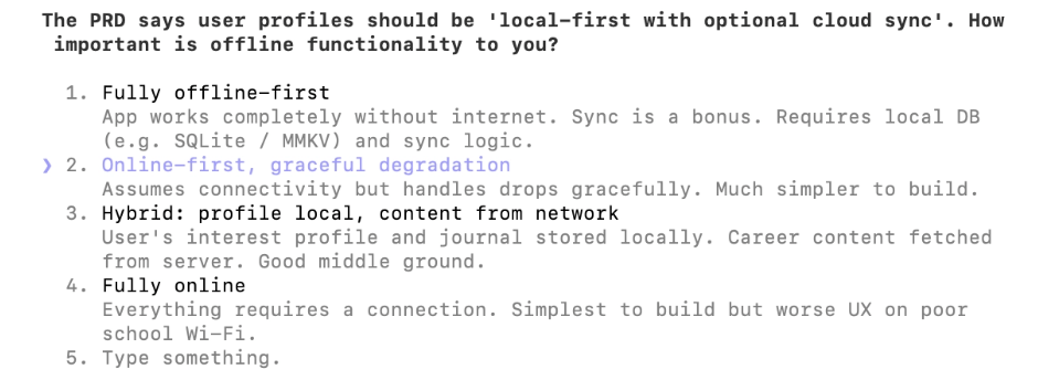 I’ll then prompt Claude Code, using its AskUserQuestionTool, to ask me questions about anything related to tech, UX, tradeoffs and data concerns before writing a single line of code. This planning step directly shapes the quality of what the agent builds. A well-structured PRD means fewer wrong turns, less backtracking, and a clear reference point to check that the code actually reflects what you had in mind.